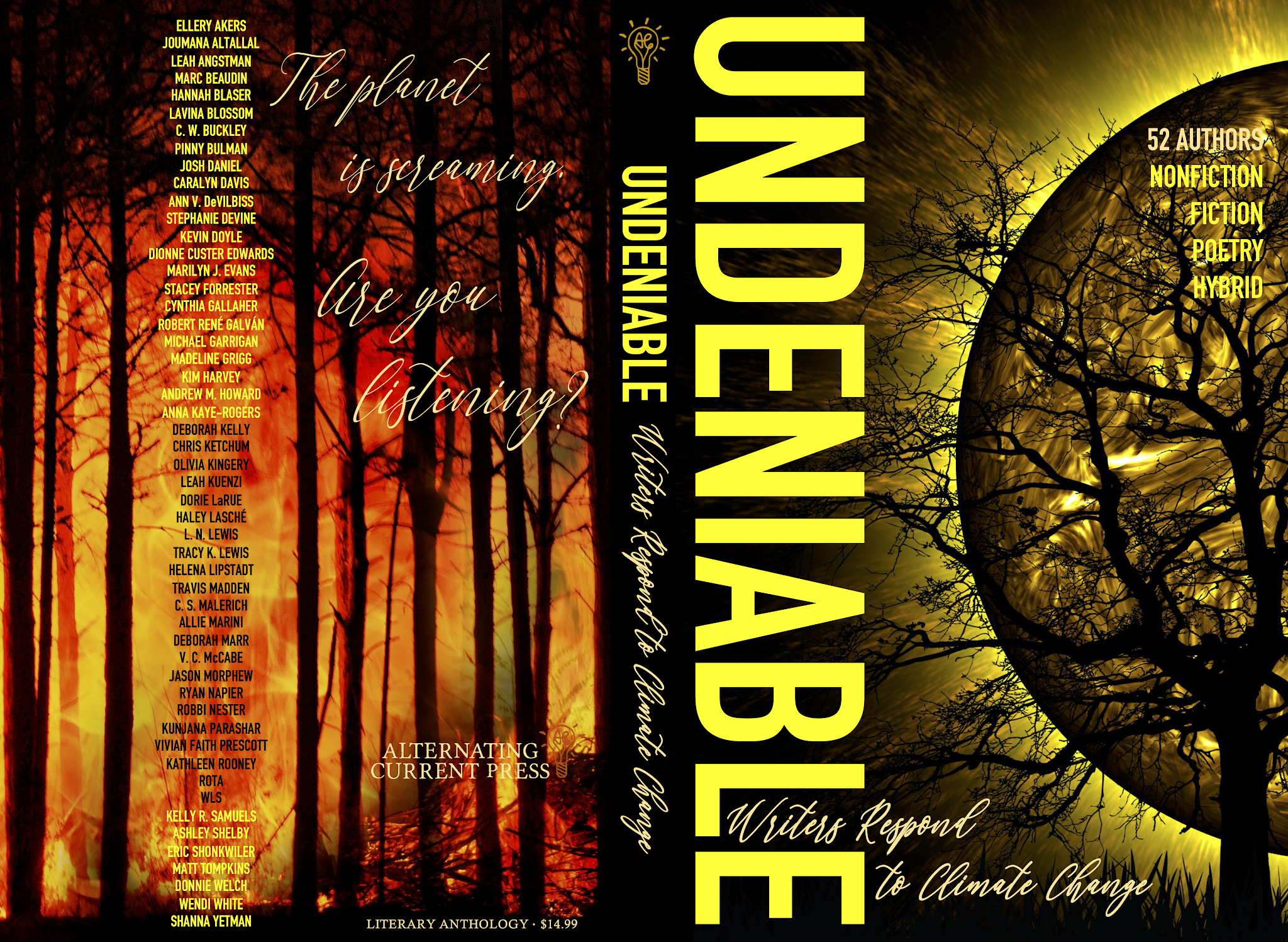 Within these pages, you’ll find a lot of dark humor—a very valid response to dealing with the grief, confronting the truth, and accepting that the U.S. government won’t do enough to help with our irreversible tilting into the tenebrous canyons of the Anthropocene, so we have to pull more than our own weight, do more than our fair share, tell our stories over and over again in the face of corporate, lobbying, ignorant, and misinformed adversity, while bracing ourselves for the worst to come. You’ll even find in these pages some sparks of utter optimism among the grief. But mostly you’ll find the horror, the shock, the devastation, the sadness you’d expect from such a heavy topic.